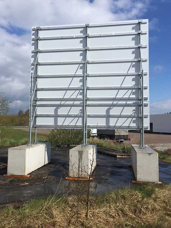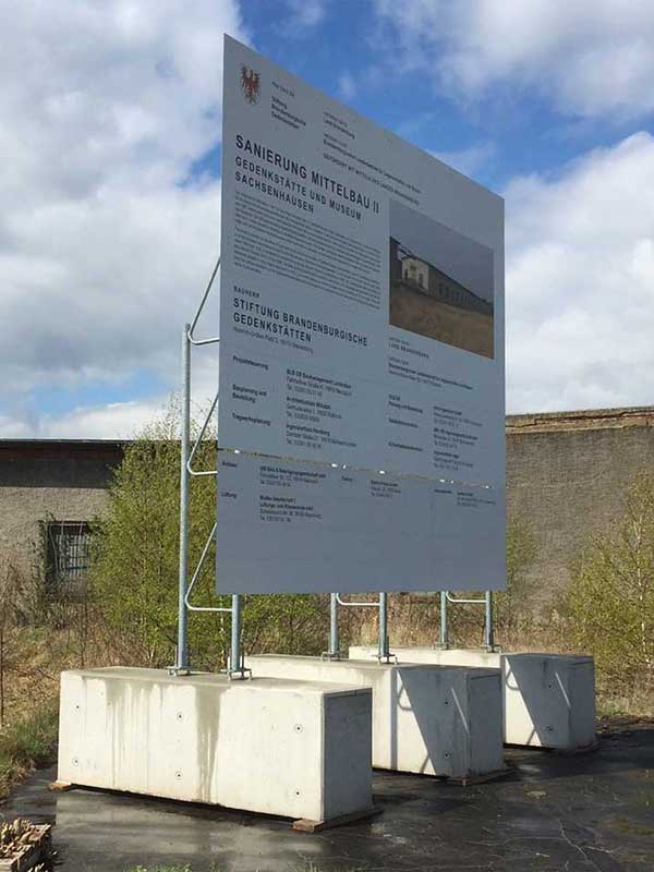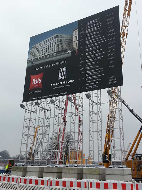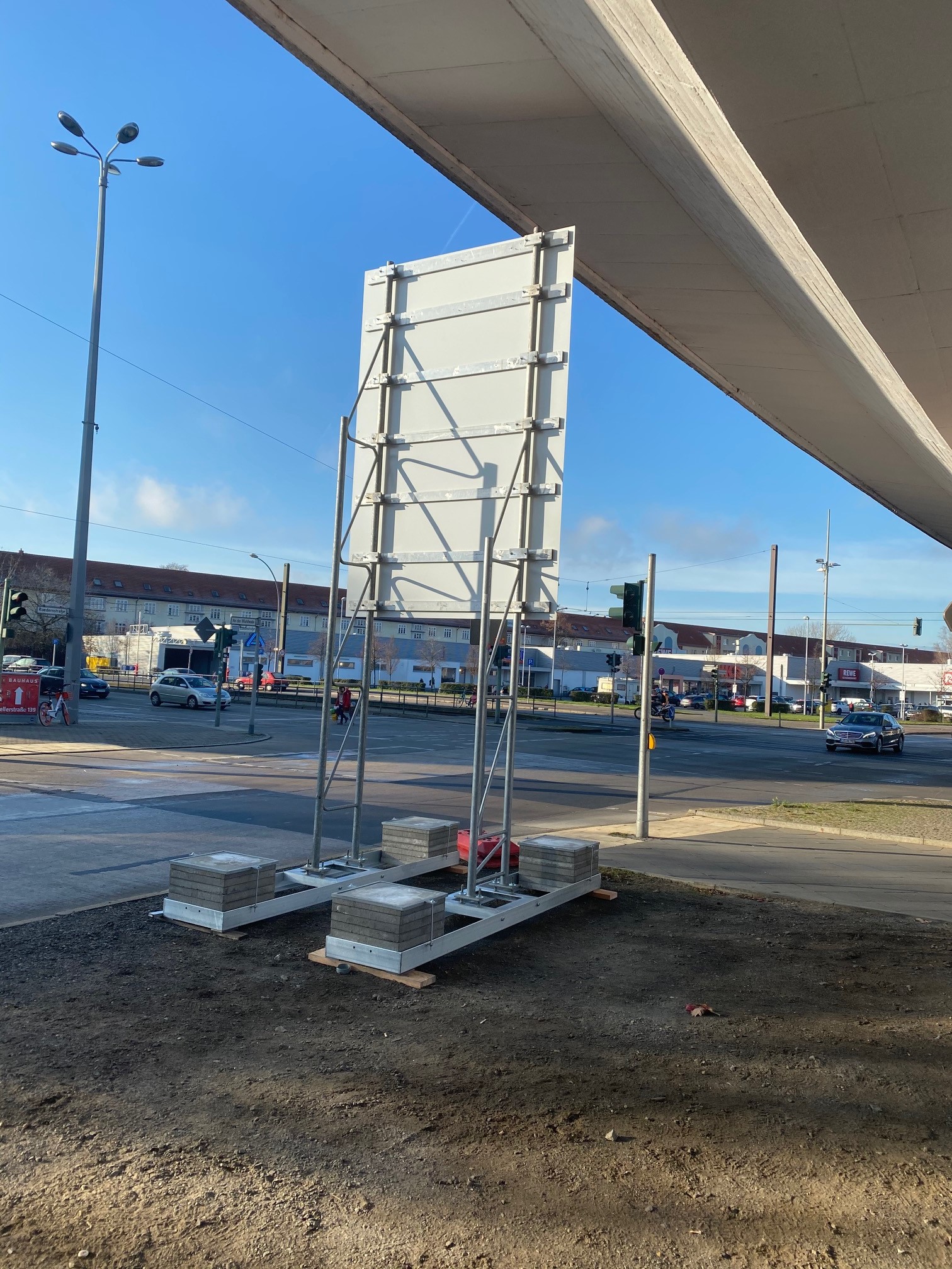 Mietbauschilder vom Typ 5 mit einer Unterkonstruktion aus Stahltraversen lassen sich zur überirdischen Montage mit einem Ballastrahmen im Fußbereich beschwer en, so das die Standsicherheit mit Fertigbetonelementen in entsprechender Anzahl her gestellt wir d. Der Standplatz sollte frei von Bewuchs wie Bäume und Sträucher sein. Eine Beleuchtung des Schildes kann durch LED-Langarmstrahler erfolgen, die über einen Dämmerungsschalter gesteuert werden