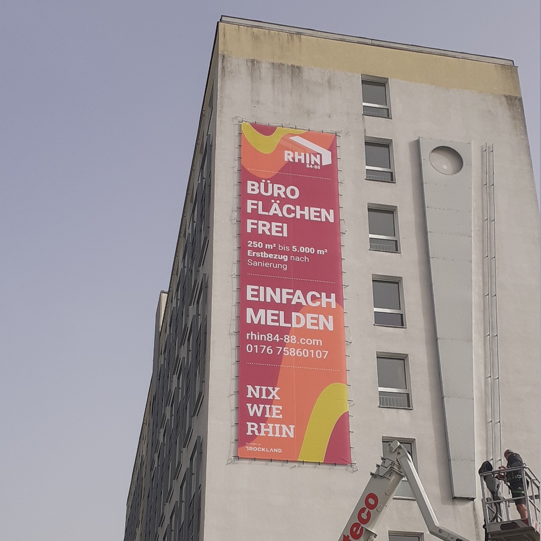 Durch die UV-Beständigkeit lassen sich unser e Netzgitterbanner hervorragend für die Gerüst- und Fassadenwerbung verwenden. Das fein gelochte, winddurchlässige Netz-Gewebe ist besonders für den luftigen Außeneinsatz. Unser Servicepaket umfasst auch die Lieferung und Montage eines Bannerrahmens aus Alurohr oder Stahlseil für Fassaden und Gerüste. Eine Beleuchtung des Banners kann durch LED-Langarmstrahler erfolgen, die über einen Dämmerungsschalter gesteuert wer den.