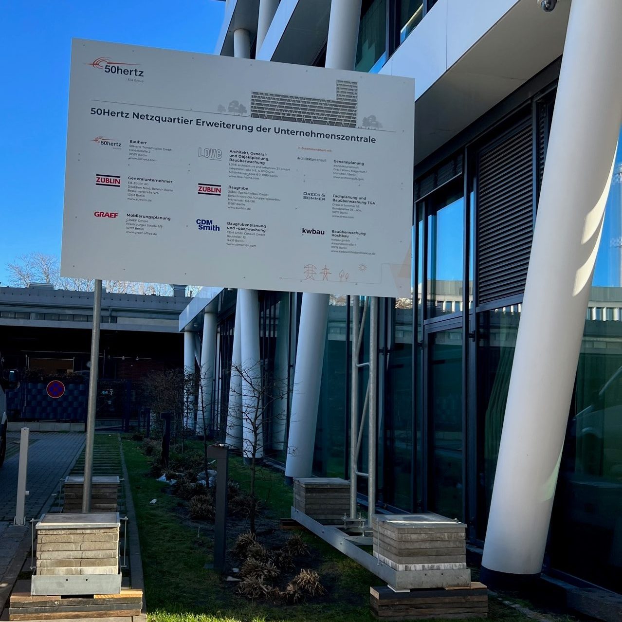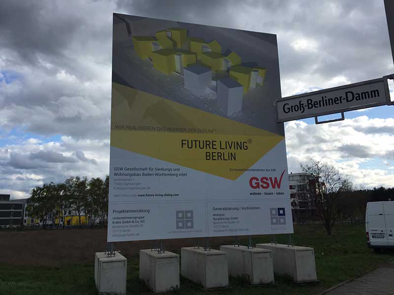 Bauschilder vom Typ 2 mit einer Alu/Holz-Unterkonstruktion zur Erdmontage sind eine Montagelösung mit einer Standzeit von mehreren Jahren. Die Alukonstruktionen wir hierbei standsicher im Erdreich verankert. Eine Beleuchtung des Schildes kann durch LED-Langarmstrahler erfolgen, die über einen Dämmerungsschalter gesteuert werden