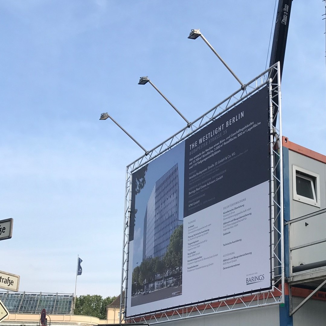 Mittels eines umlaufenden Spannrahmens aus Zweipunkttraverse, können wir Ihr Bauschild als Banner am Container befestigen. Das fein gelochte, winddurchlässige Netz-Gewebe ist besonders für größeren Winddruck geeignet. Unser Servicepaket umfasst neben der Herstellung auch den Transport und die Montage. Eine Beleuchtung des Banners kann durch LED- Langarmstrahler erfolgen, die über einen Dämmerungsschalter gesteuert werden.